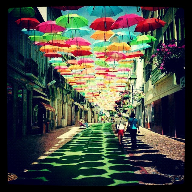 Agueda, Portugal. Con paraguas colgados como del cielo, el artista ha creado una alegre instalación por las calles de esta localidad. La luz, al atravesar los paraguas, se refleja por los edificios, la calle y las personas que andan por debajo. Podemos ver una instalación parecida estos días en Barcelona, en la plaza del sol, debido a las fiestas de gracia.
