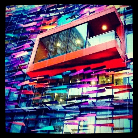 Aquí otro ejemplo de fachadas con vidrios de colores. Dan luz y alegria al edificio.