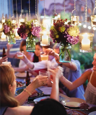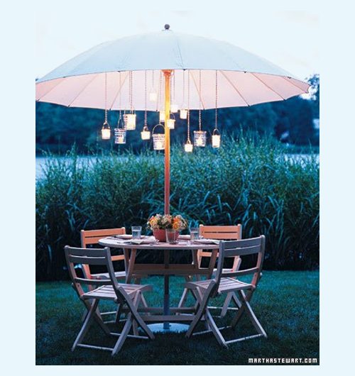 Si dispones de una sombrilla central de mesa, puedes colgar de las aristas unos candelabros. ¡¡Procura que las velas sean de las pequeñas flotantes, para que no quemen la sombrilla!!