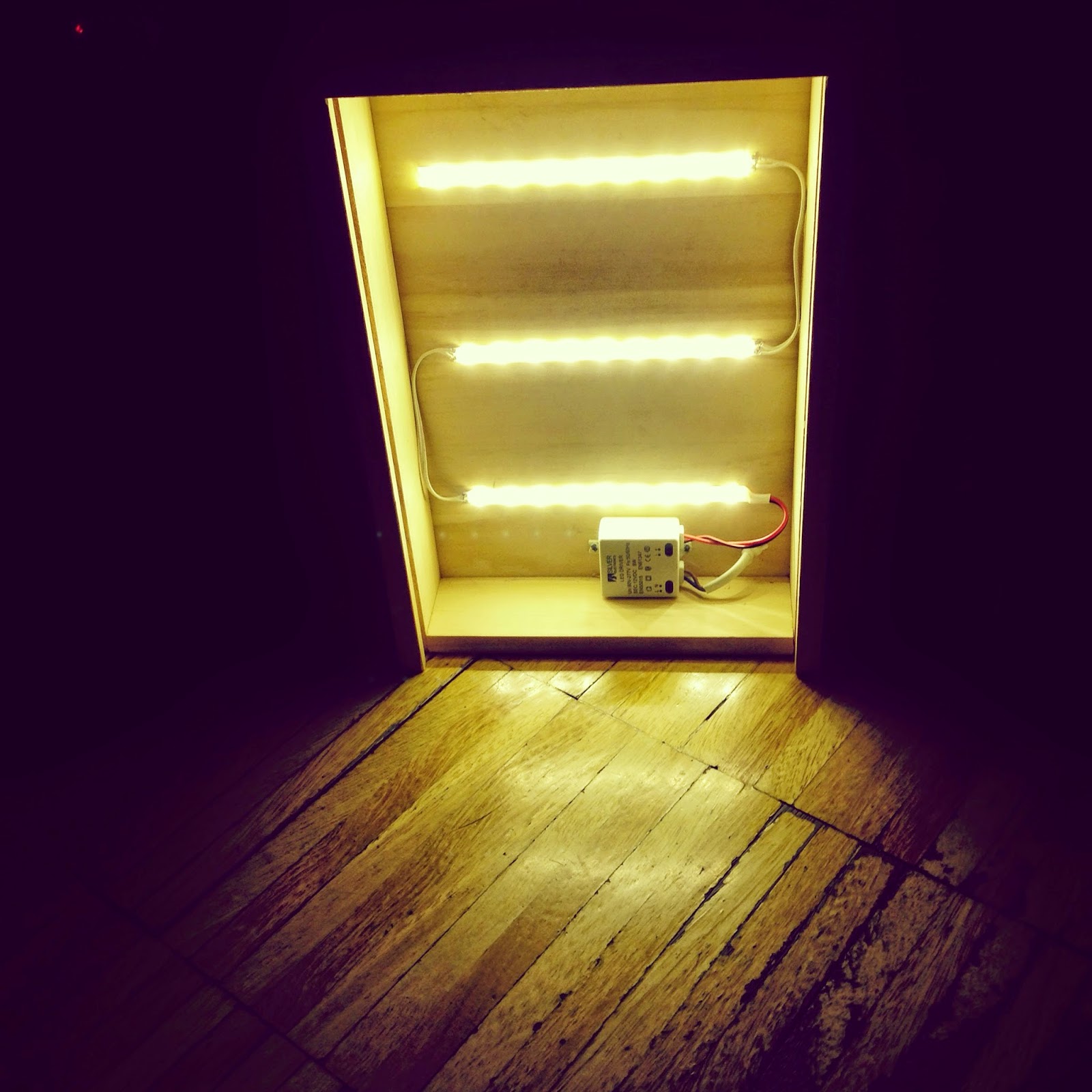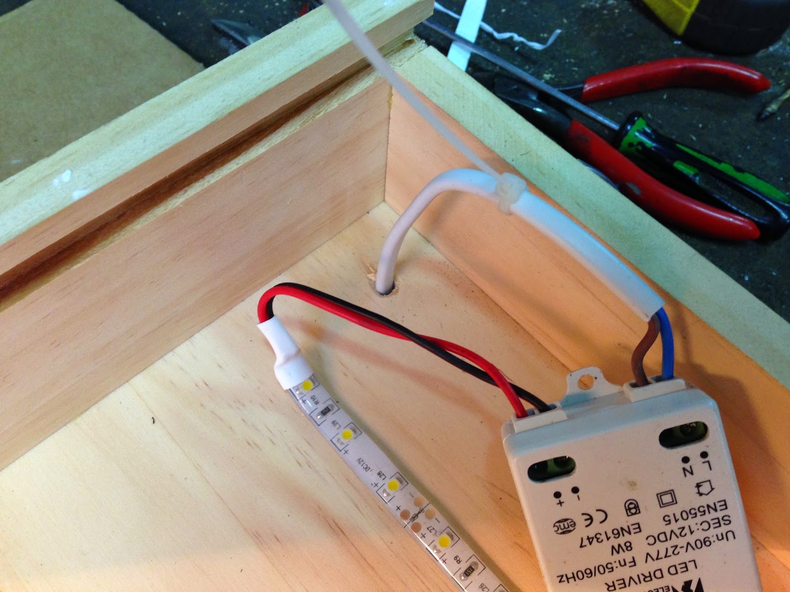 Y una vez todo el sistema de tiras de led unido, lo pegamos a la caja de madera en la colocación que creímos conveniente, y finalmente unimos los leds y el cable a tierra con el transformador.