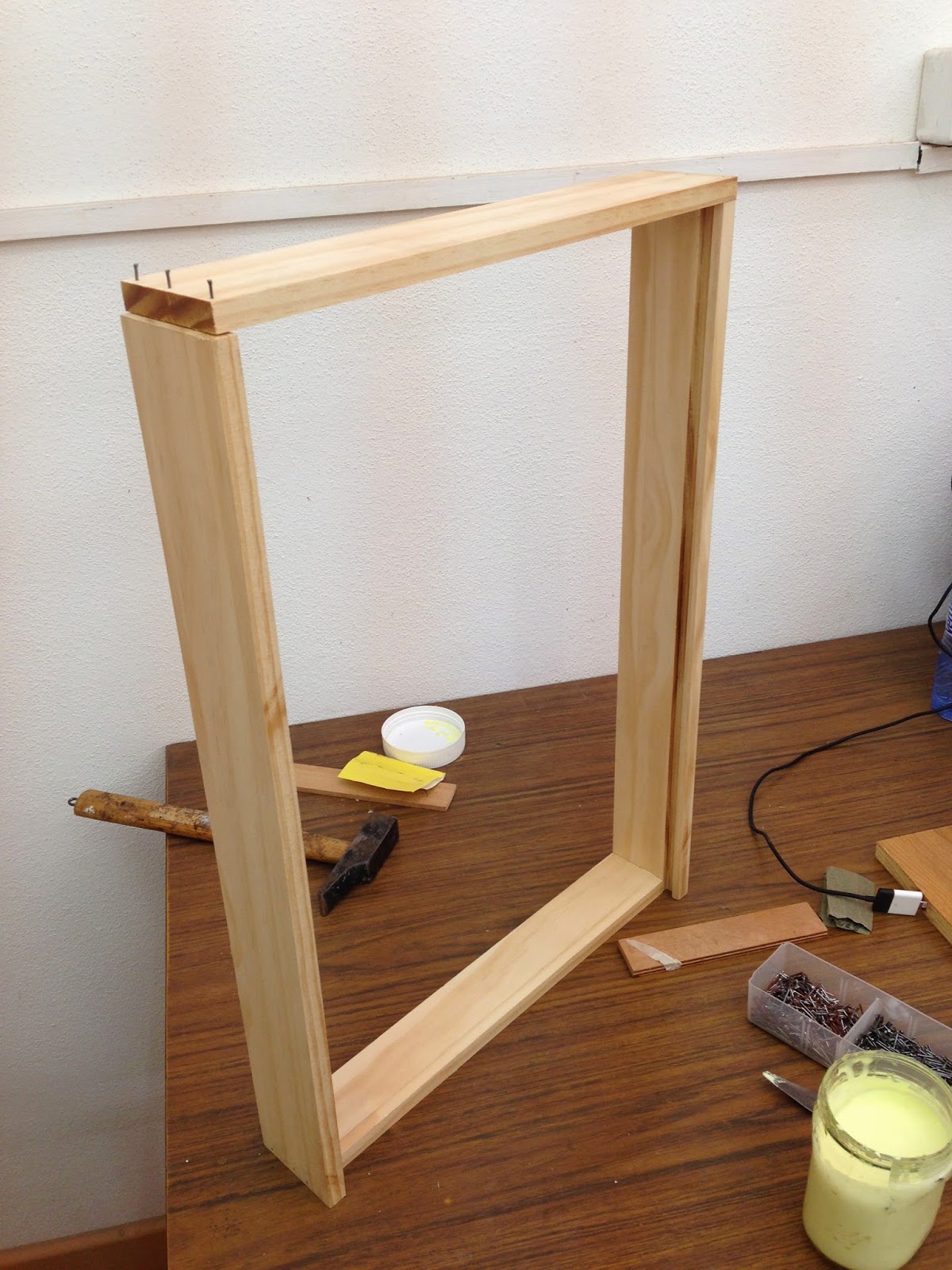 Con las maderas ya cortadas a la medida exacta, empezamos con el montaje de las cajas. Los materiales necesarios para esta fase son: maderas, clavos, cola de conejo, sargentos de sujeción, martillo, tenazas, papel de lija, masilla y una espátula.