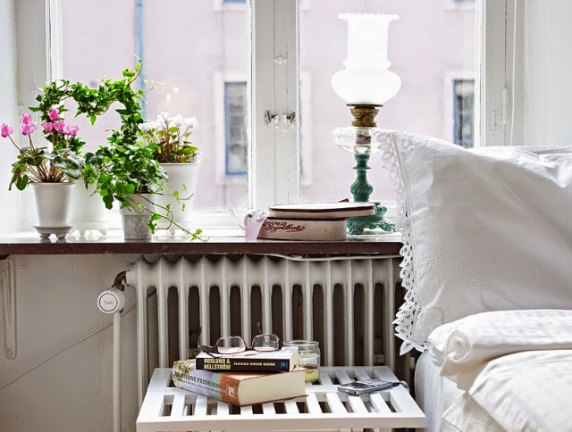 El rincón escogido de hoy parece ser de un dormitorio. La zona importante a destacar es la banqueta estilo escandinavo que han escogido para usar a modo de gran mesilla de noche y estantería para dejar libros y otros objetos.