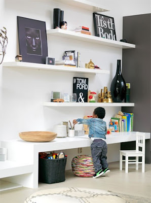Los juguetes pueden ser un elemento decorativo más de la habitación. Coloca unas estanterías longitudinales y deja que el mismo ordene allí todos sus juguetes. Llenarás la estancia de color.