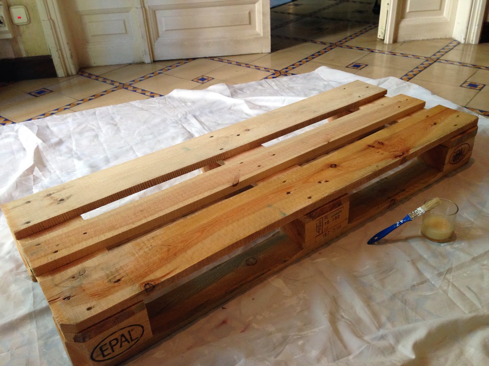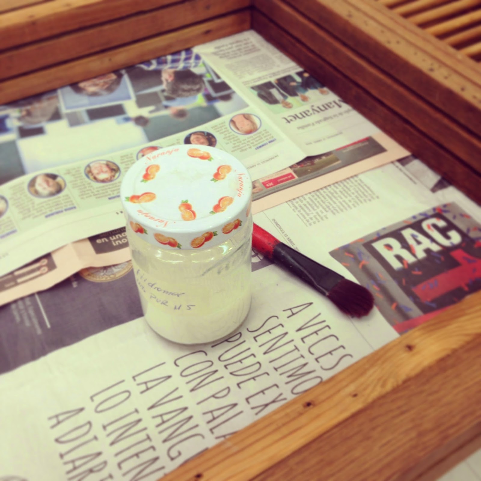 Como la plantilla era más pequeña que la madera, primero hicimos una parte, esperamos a que secara, y después volvimos a colocar la plantilla encima, encajando los agujeros, para poder seguir y hacer la madera al completo.