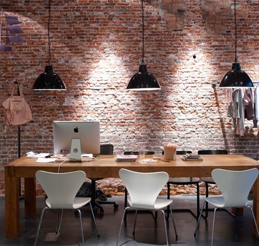 Suelos de hormigón, paredes de ladrillo y el mobiliario como lámparas colgantes metálicas y una gran mesa de madera hacen que este despacho situado un un loft en Amsterdam respire aires industriales.