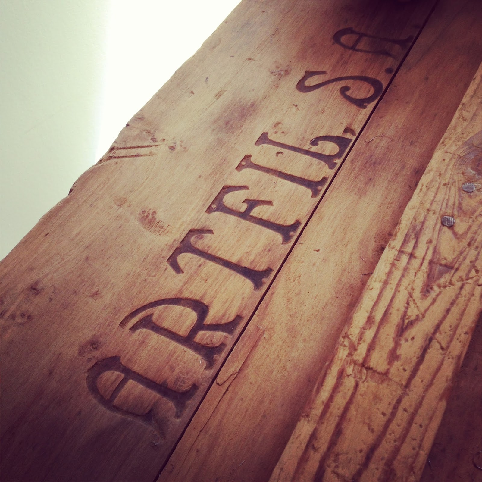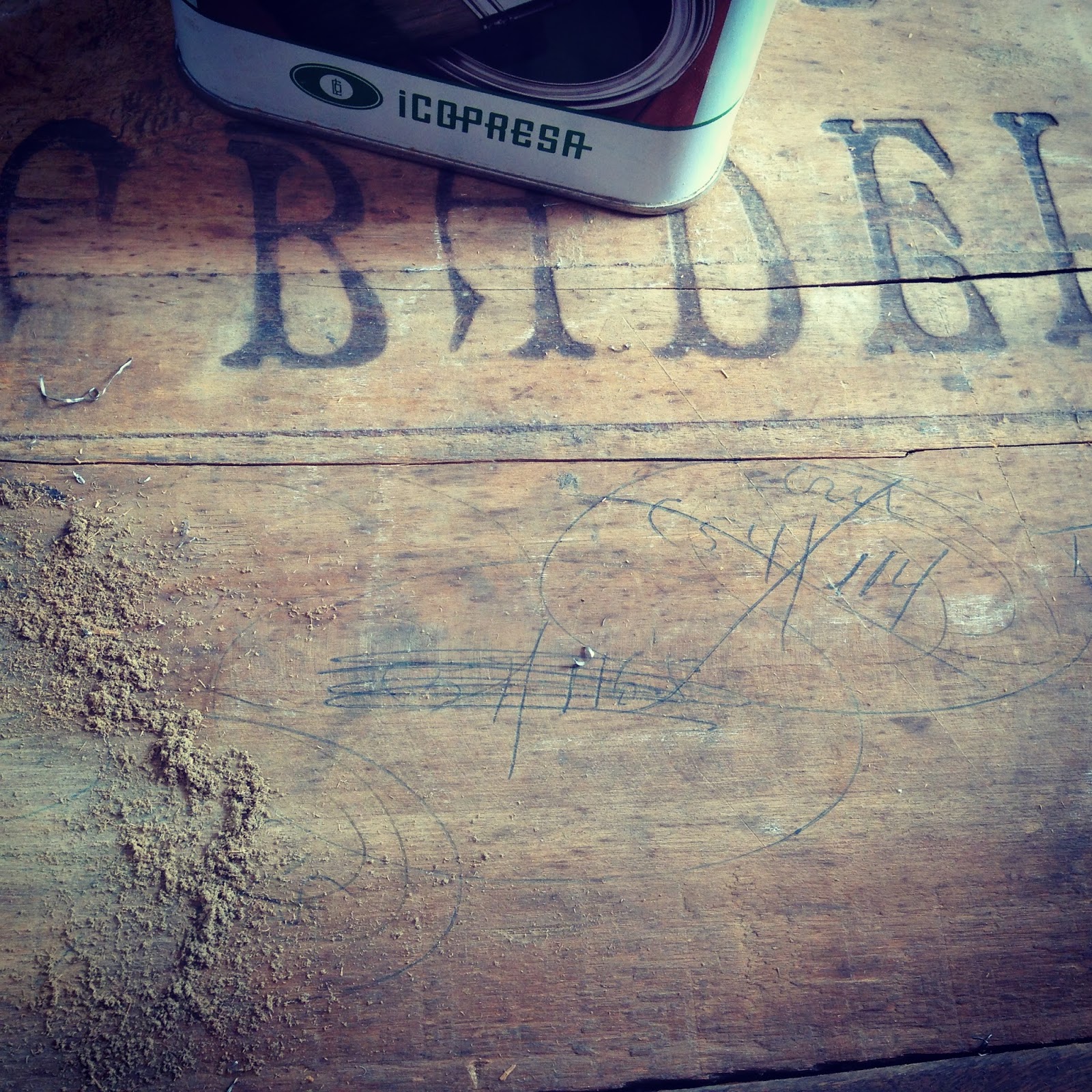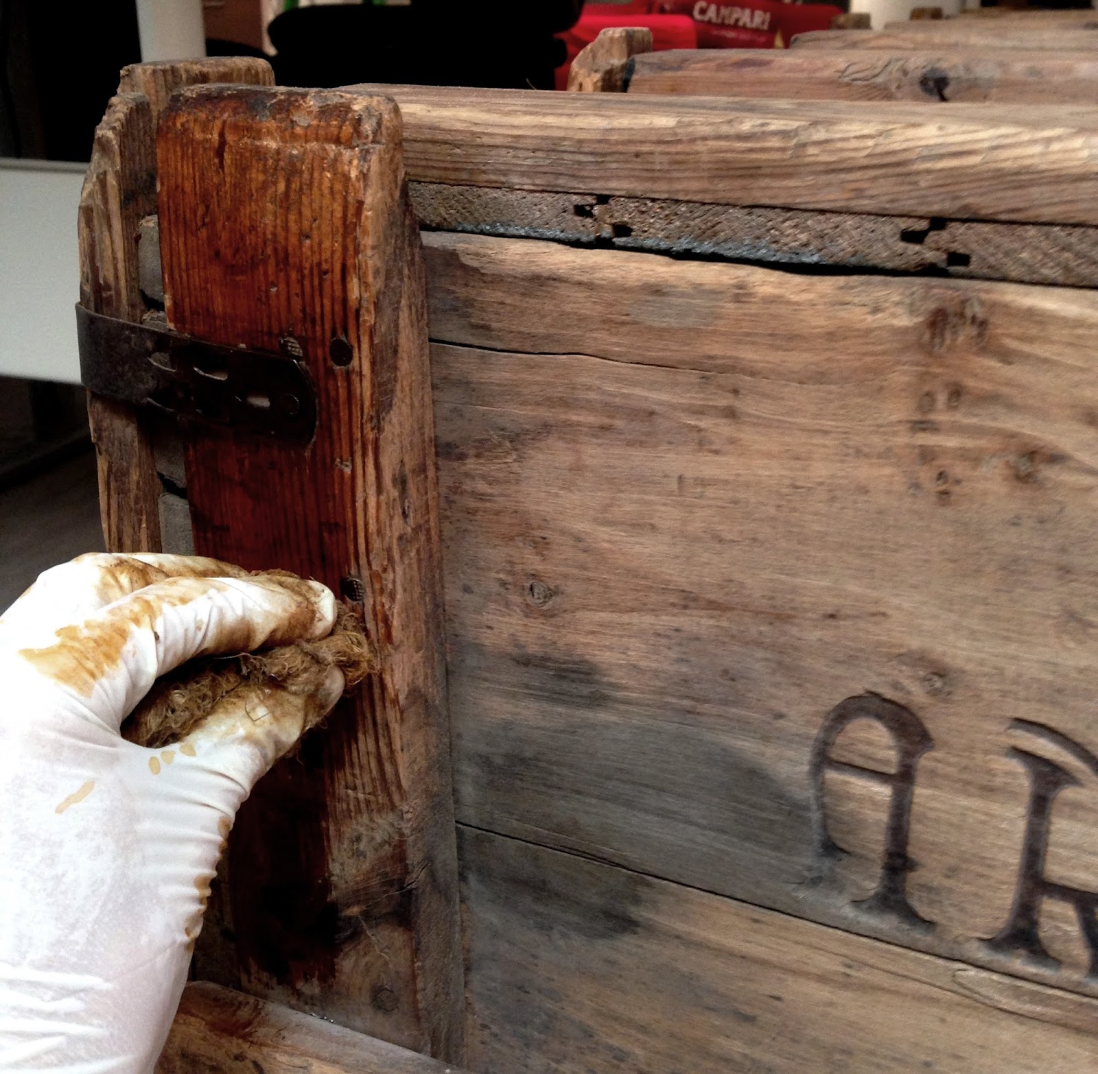 Lo mismo que en las imágenes superiores, donde vemos como con estropajo de aluminio, decapante y disolvente hemos podido eliminar las letras escritas a rotulador de la parte superior de la caja, dejando sólo las letras de ARTFIL quemadas creando un bajo relieve, y las vetas originales de la madera.